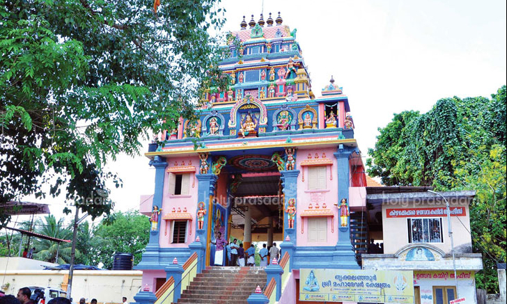 more ascending steps of the Gopuram leads to the sacred idols of Indilayappan (Sastha) and the Maha Shiva idols, which is the presiding deity of the Mahadeva Temple. Because of the presence of the Mahadeva and Sastha idols in the temple, there are two Dhwajas (towering flag posts coated with copper) adjacent to each other which is a rare spectacle seldom seen among other temples. The Maha Shiva idol and the Sastha idols are installed facing each other in this temple. The real name of this temple is ‘Sankarapurathu Mukkalvattom Devaswom’ popularly known as Thikkalanjoor Sree Mahadeva Temple. The temple because of its geographical location functions as an important ‘Edathavalam’ – Pilgrim center giving shelter and refuge to pilgrims who come to visit Sabarimala via Punalur - Moovattupuzha State Highway. The sanctum sanctorum of Lord Mahadeva was constructed in circular manner and in ancient Kerala sculptures as in the renowned other Shiva temples of Kerala. The artistically decorated towering Gopurams on the East and West Nada and the Anakkottil - waiting shed for elephants during the festival ceremony are indeed rare specialties. There is a well-furnished auditorium on the northern side of the temple with a seating capacity of more than 500 people. There is also vehicle parking facility on both the eastern and western sides of the temple. The main deity of the temple is Lord Mahadeva installed in the form of Linga idol surrounded by other deities which are the Swayambhoo Sastha, Mannadi Bhagavathi, Mahaganapathi and other upadevathas (sub-deities) such as Bhoothathan, Rakshas, Yakshi and Nagaraja. The legendary concept about the origin of this temple is that the main deity was installed by the majestic saint Khara who was an ardent devotee of Lord Shiva and it claims an antiquity of more than 1100 years. In those ancient times this place where the temple is now situated was covered with thick evergreen forest. Saint Khara performed penance here and was successful in pleasing Lord Shiva by his profound devotion and sacrifice. Lord Shiva gave him three Shiva Lingas out of which one was a Mahashivalinga for installation at three different places for propagating devotion and for prosperity. Saint Khara installed these three Shiva Lingas during an auspicious time at three different places at an equal distance from each other in the east-west direction. The Maha Shiva Linga was installed at Kalanjoor and the other two were installed at Peringanad and Arukalikkal. The Thanthram of this temple is performed by Kulakkada Thamarassery Nambi Madom and the present Thanthri (Chief priest) is Brahmasree Ramesh Bhanu Bhanu Pandarathil. Pillavaipu, Jaladhara, Pushpanjali, Mrithyunjayahomam, Adithyanamaskaram, Therali, Unniappam etc. are the major offerings here. The annual temple festival starts in the Malayalam month of Meenam (March/April) with the star Utrittadi, when the flag is hoisted and ends with Thiruvathira Arattu. The festival is for 8 days and on the 6th day during the star Rohini the Indilayappan festival is celebrated. All the famous artists from South India participate in this festival. The festival is famous for its Carnatic music heritage. Great Carnatic musicians like Chembai, Chemmamkudi, Balamuralee Krishna, Yesudas, Sheshagopal etc have also rendered their Carnatic concerts in this mega festival. Other than the carnatic music concerts, Kathakali and other classical arts are also being performed in this temple during this festival. Kalamezhuthum Pattum for Indilayappan and Sastha and 41 days bhajan in Mandala pooja (December/January), Shivaratri, Ashtami Rohini, Bhagavatha Sapthaham during the Malayalam month of Dhanu (Jan/Feb), Ramayanamasam, Vinayaka Chathurthi, Pongala, Pathamudayam etc. are some other festivals. The most important offerings made in this temple are Mruthyunjaya Homam, Panthirunaazhi and Pillavaypu. Mruthyunjaya homam is offered to Mruthyunjaya moorthi to ward off death and diseases. In Panthirunaazhi a special preparation made from 12 ½ measures (idangazhi) of rice is offered to Mahadeva for fulfilment of the desires of the devotees. Pillaveypu is an offering made to Indilayappan, and is unique to this temple. This is conducted for begetting a child and is performed on the day of star Rohini, especially in the month of Meenam. On that day an idol carved from stone is brought in a procession at the time when all the lamps are lighted and is offered at the sanctum sanctorum of Indilayappan. The day-today administration and routine temple activities are being carried out by Thrikkalanjoor Sree Mahadevar Devaswom Trust (a family trust consisting of members of Plastanathu Madom). Brahmasree Ramaru Vasudevan Potti is the present Chairman of the Trust. The other rare speciality of this temple is that the members of the Plasthanathu Madom are conducting daily poojas. The present chief priest (Melshanthi) is Brahmasree Jithesh Raman Potti who has had his 7-year tantric studies in Thanthra Vidya Peedam, Aluva. In this temple there are three wells for the daily pooja. The main well is inside the Nalambalam. The other two are in the North and South of the Prathikshina path way. Even in summer, the water level of these wells remains full. It is believed that the ruling Prince of Travancore, Ayilyam Thirunal, visited the temple to worship there and was pleased at the way the temple was being maintained. He therefore sanctioned paddy and oil for the lamps in the temple. Even today the temple continues to receive it from the Devaswom Board. The major developments and renovation works were achieved during the governance of Late Brahmasree Ramaru Ramaru Potti, the former Chairman of the Devaswom Trust, with the cordial relationship with the devotees. The temple has become famous and also prospered very well due to the efforts of the Plasthanathu Madom family and the devotees of the place who have contributed magnanimously, liberally and sincerely for its development and we
