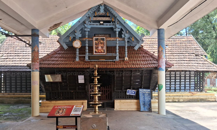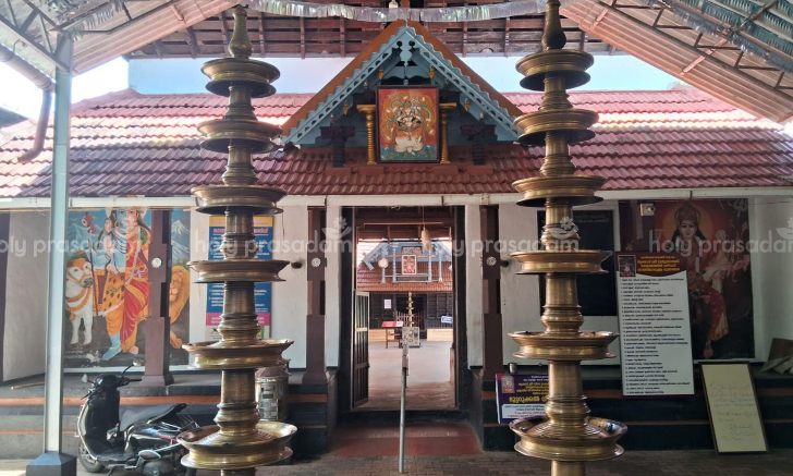 more temple was severely damaged and Tippu made it his storehouse for weapons. In 1861, Zamorin renovated the temple. The main consecration is Goddess Durga with four hands bearing the conch, disc and showing the Varada mudra and kateebadhahasthabhaava. The Goddess is consecrated facing the east. Sreekrishna, Ganapathy, Hanuman, Ayyappa, Nagadevatas and Brahmarakshass are consecrated as subordinate deities.