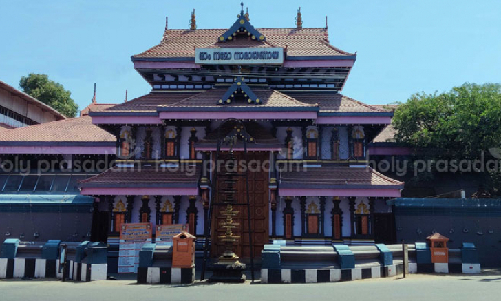 This famous temple is situated on Shornur Road about 1 km north of the Vadakkumnathan Temple at Thrissur. This is one of the main participants in the world-famous Thrissur Pooram with Paramekavu as the other participant. The main deity is Unnikrishnan (the Lord as the infant). There is Bhagavathy to the left of the sanctum. Lord Ganesha and Dharmashastha are consecrated in separate shrines outside the Nalambalam. Legend says that the original idol was that of Parthasarathy and was in a temple at Edakkalathur, 15 km away from Thrissur. When there was a communal disturbance there, the people removed the idol and took it to more Thrissur. It was handed over to a Namboothiri couple at Kachanappilly Illam. They considered it as their own child and consecrated it in a small temple. The idol gave up the whip of Parthasarithi and took up the flute in one hand and the other was kept ever ready to receive the butter offered by the foster parents. The couple were also ardent devotees of Kodungaloor Bhagavathy and the man used to walk the 40 km to worship the Goddess at Kodungaloor. As old age made it impossible for him to undertake such an arduous walk, he felt heartbroken. The Goddess followed the man and her power got enshrined in the granite pillar at the Nalukettu (the inner courtyard). It is this consecrated pillar with Devi’s power that is in the sanctum to the left of that of the lord Balabhadrakali. Just outside the wall of the temple are consecrated Kukshi Ayyappa, Manikanda, Ghandakarna, Raktheswari and Bhairava. The sanctum sanctorum of the Lord was reconstructed in Krishnashila in 2011 with the dome at the top covered by gold-plated copper plate.