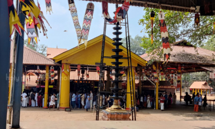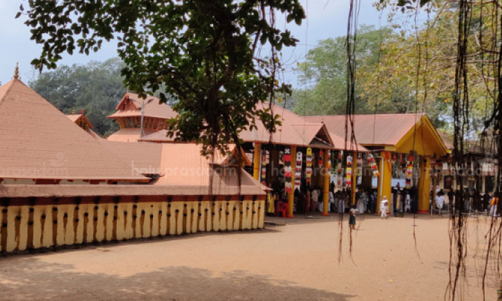 more this temple was performed by Theeyas from Malabar. Even today the Theeya Thandaans of 64 tharas meet at Nilapaduthara at the temple in the presence of the Raja of Kodungalur at the beginning of the Meena Bharani festival which is conducted under the Thandaans. The consecration with Siva at one end, Ganaesha at the other and Sapta Mathrukkal in between, which is seen here, is referred to as Rurujit Vidhaana.