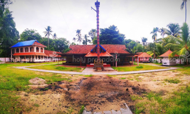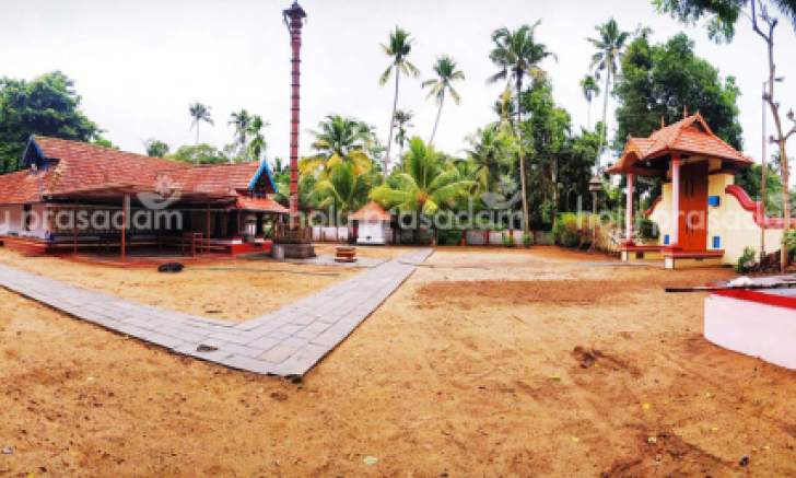 A long time ago the area where the temple stands today was affected by contagious diseases and natural disasters, making life impossible for the inhabitants there. During that time a Brahmin, who was a Yogi and a scholar came there. The people told him about the condition of the place. He assured them that all would be well in a short while. This Brahmin went to have a bath and offer his evening prayers at the pond near the Moothedath mana, a prominent Brahmin house there. He kept the three salagramams (sacred stones) and his palm leaf umbrella on the banks of the pond. But