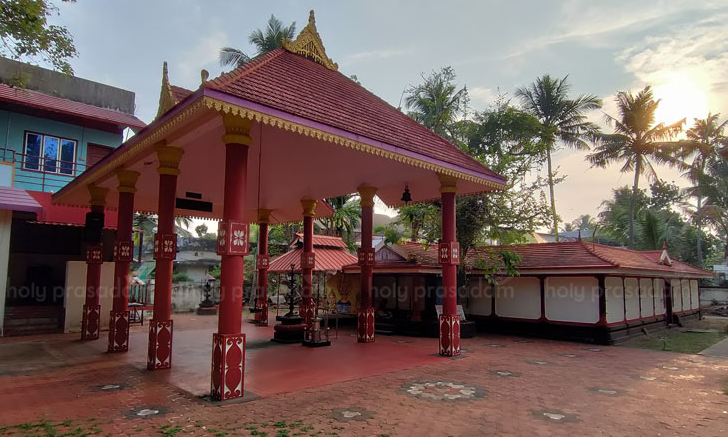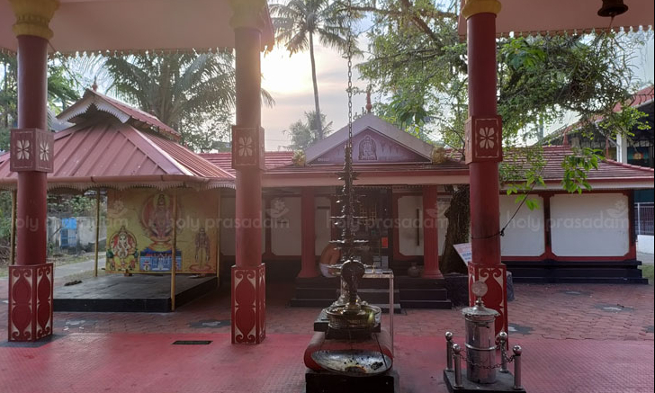 more other side of the canal. Kochayyappan was instructed to take him there. He helped the aged ascetic get into the boat and made him sit down before rowing to the other side. But on reaching there he found that the ascetic was dead. He brought him back and informed the king about it. As per his instructions the body was buried in front of the land given to Kochayyappan. A sapling was planted at the site as per custom. The sapling grew to be the tree that we can see before the Balabhadra Devi temple today. The presence of the Goddess is believed to be present in the tree. When Kochayyappan’s wife went to bail out the water from the boat she found a small gold idol there. She kept it on the stone at the Kalari where students prayed before starting their practice. Soon a divine revelation about the idol was received. It was declared to be the 7th daughter of the Goddess at Kodungalloor in the form of a young girl. It was also made known that a goat and rooster should be sacrificed and Kalamezhuthum Pattum as well as Kalamkarikkal should be performed. Even if the offerings were given in coconut shells, the Goddess would be pleased. Hence the practice of offering Guruthy in coconut shells is continued even today. The Dheevara Mandalam Sabha, formed according to the orders issued by C.P,Ramaswami Iyer manages the affairs of the temple. The temple festival is conducted in the Malayalam month of Medam.